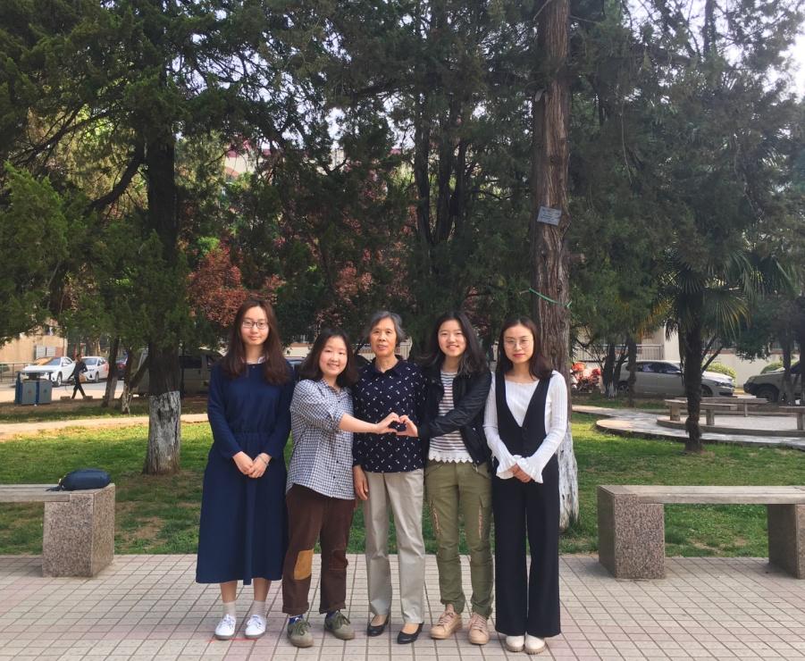 采访小组成员与张书霞老师在松树下的合影