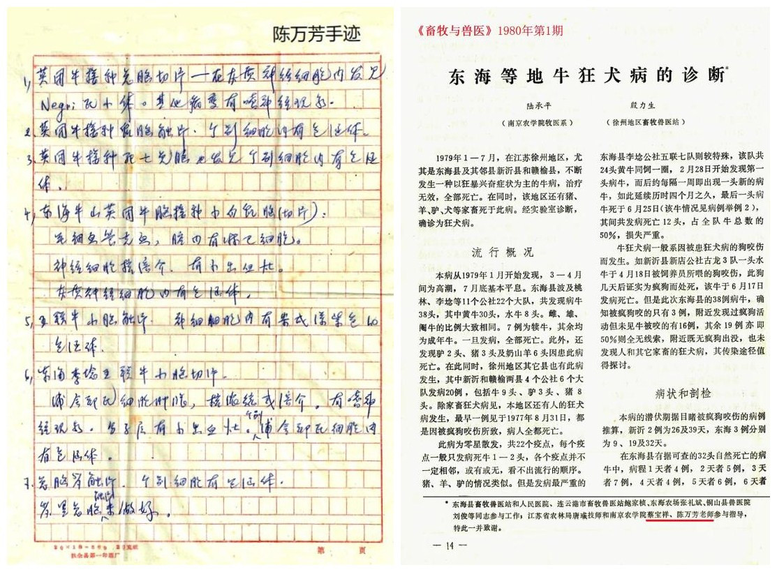 1980年第一期《畜牧与兽医》杂志发表文章:“东海等地牛狂犬病的诊断”,我第一作者,徐州地区兽医站的殷力生为第二作者,仅此二人。陈先生及蔡先生都没有具名,只是在长长的致谢名单中,提了一句。试想蔡是我的导师,陈是在位的系主任,文章署名居然可以不放!那时候学术风气之好,值得回味,二位先生的风格之高,令人钦佩。
