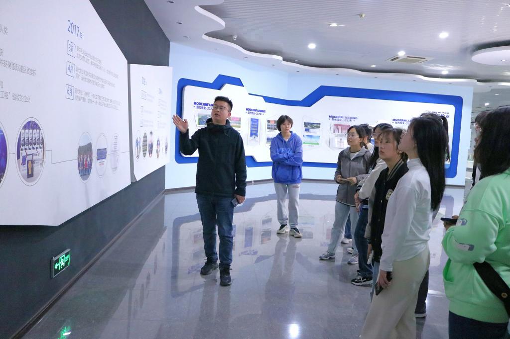 在崔兵兵带领下,团队一行人走进现代牧业“零距离一体化牛奶工厂展厅”,全面学习、了解现代牧业集团发展历程、主营业务、技术创新、战略发展等内容,近距离观摩了转盘式挤奶系统、自动化牛奶生产线等,就目前国内奶牛牧场分布、奶牛良种培育等内容进行答疑。在公司标志性建筑“八角楼”的观光平台中,崔兵兵结合牧场布局,详细介绍了“饲草种植-奶牛养殖-粪污处理-沼气发电-粪肥还田”的绿色循环产链条,系统阐述了“资源化循环利用”目标。