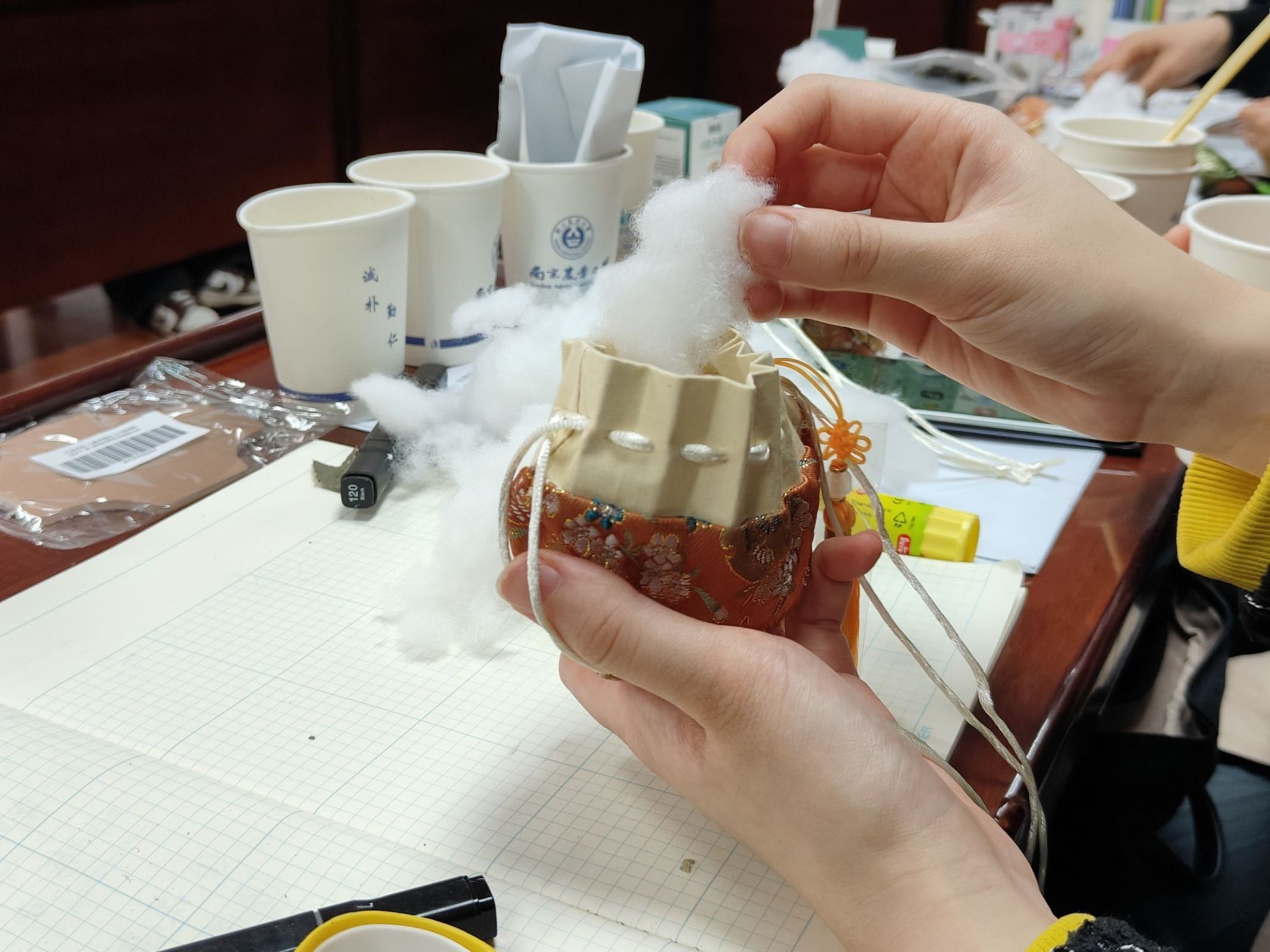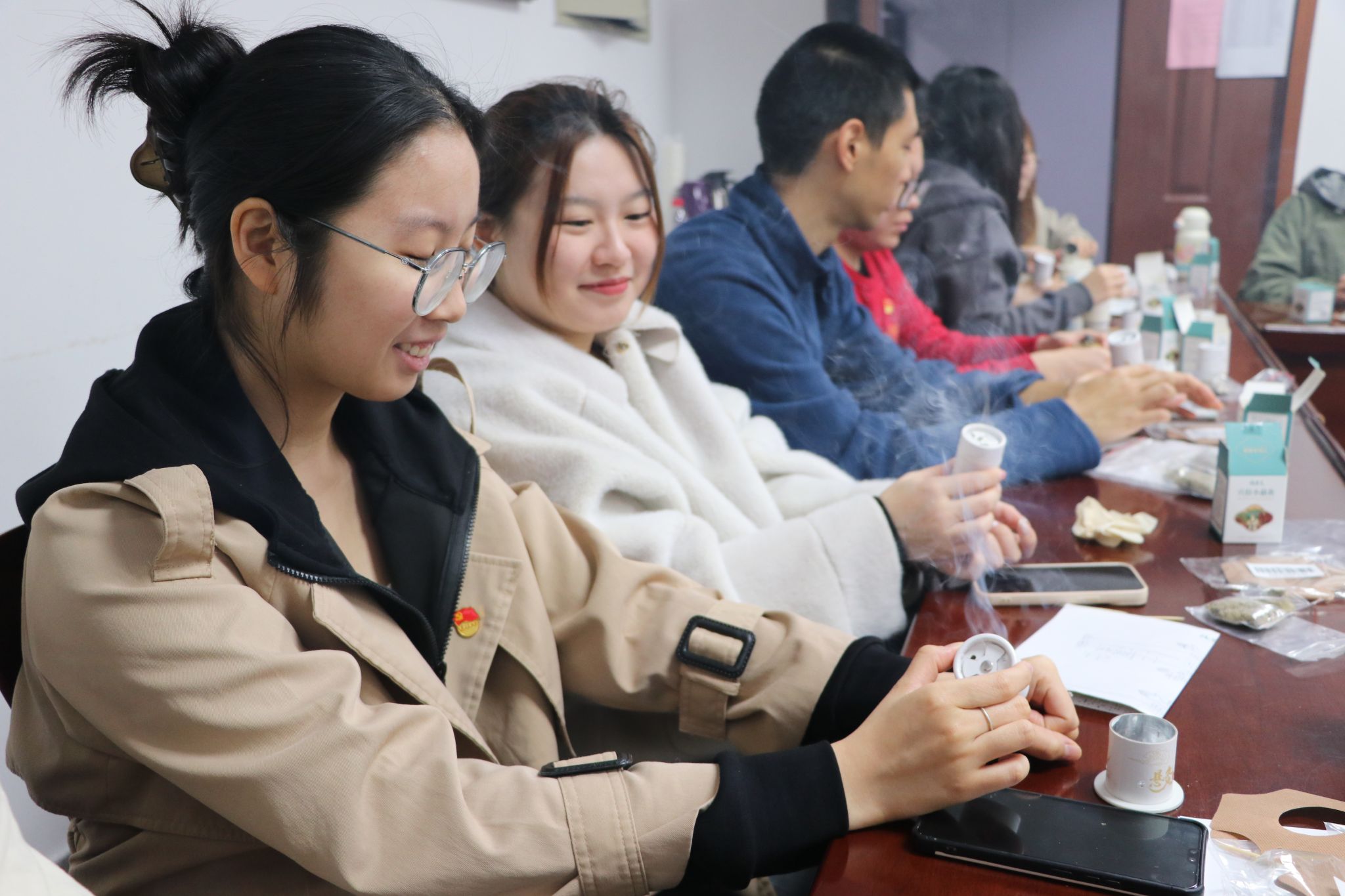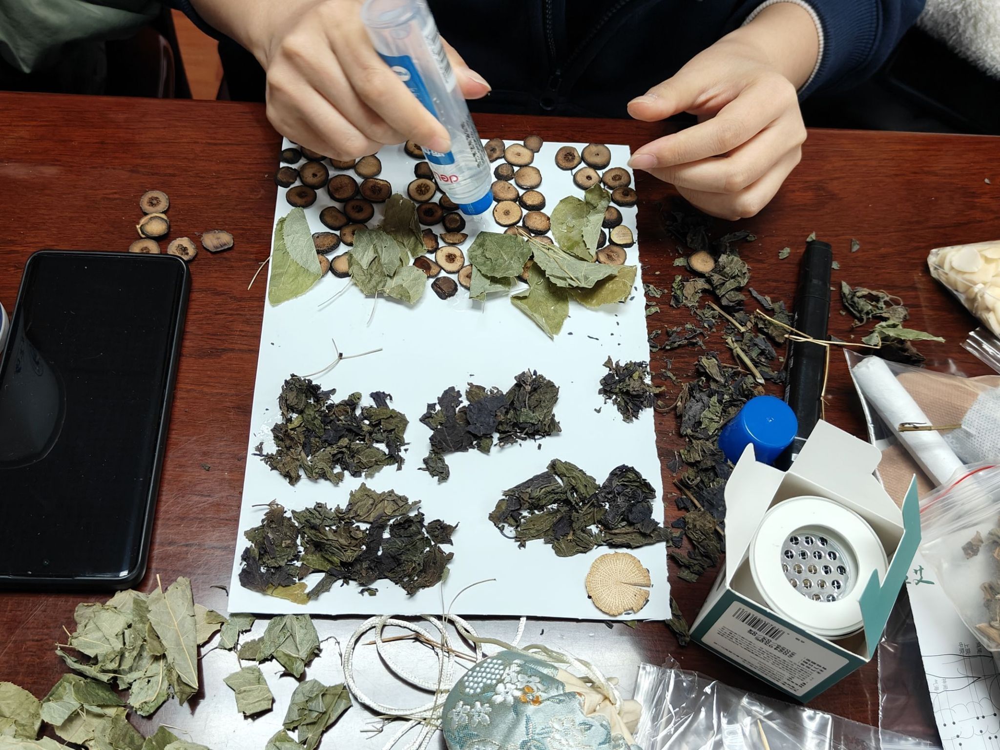 在中医药文化体验环节,双方共同开展了隔姜灸教学、中药香囊制备、中药剪贴画、花茶冲泡品尝等活动实践。