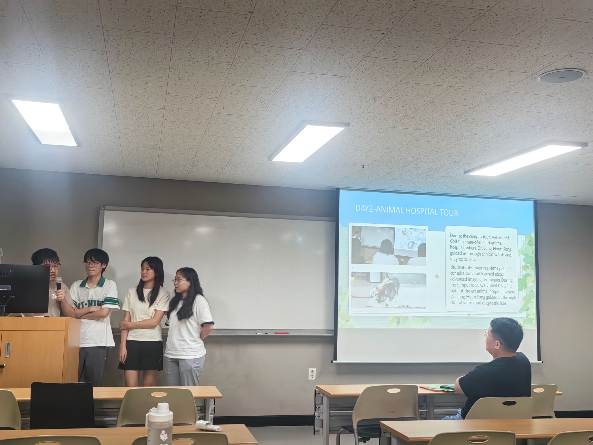 交流临近结束时,班级成员共分成4个小组,从专业学习实践、知识认知收获、生活体验感悟等多个维度,汇报分享在韩期间的思考、感悟与心得。忠南大学动物医学教授Shin,对同学们在交流期间的积极表现予以充分肯定,并代表所在学院为同学们颁发结业证书。