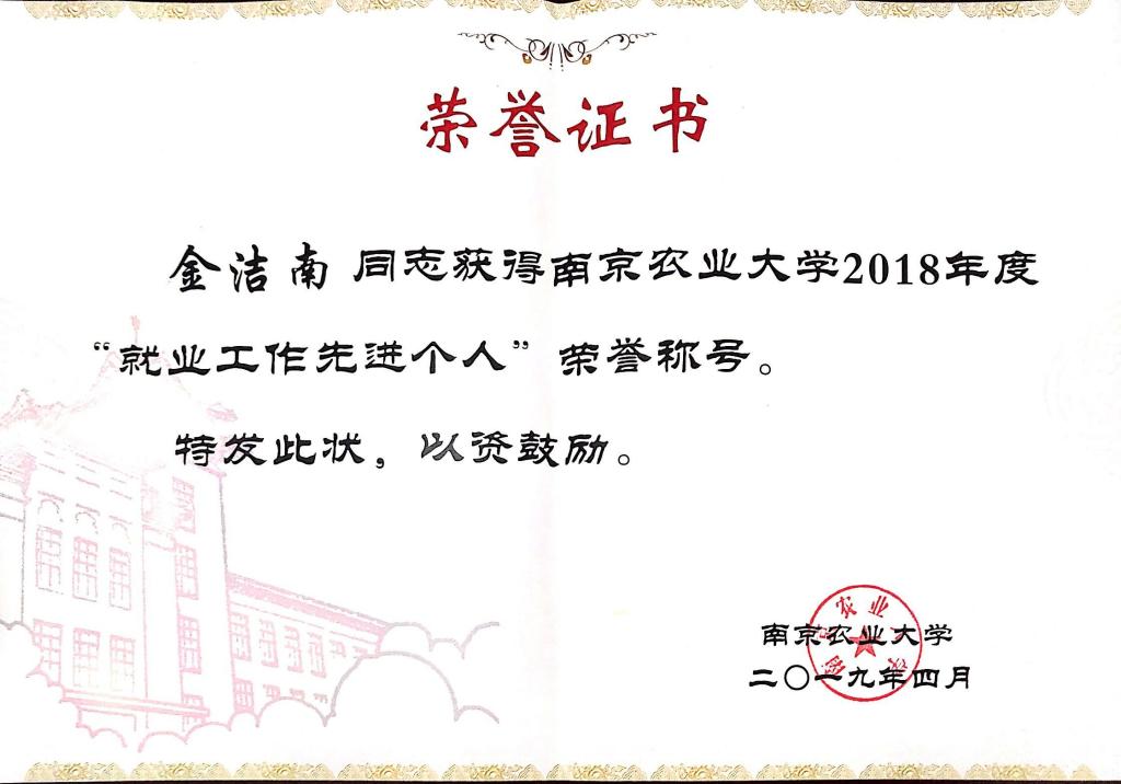 金洁南获德赢Vwin官方区域合作伙伴2018年度就业工作先进个人