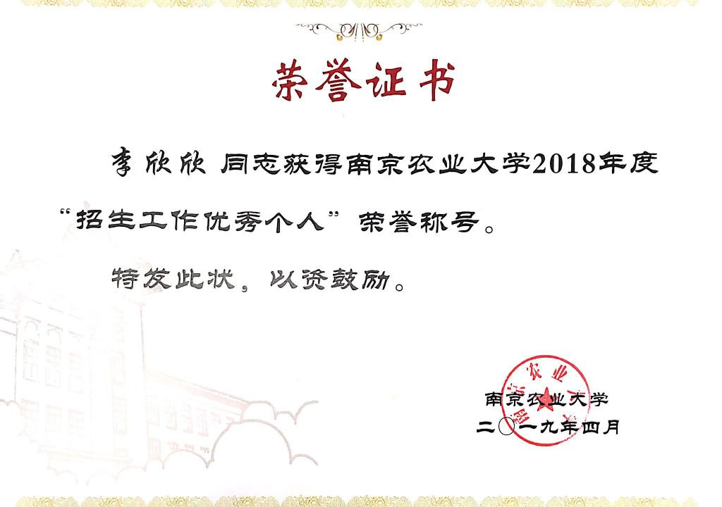李欣欣获德赢Vwin官方区域合作伙伴2018年度招生工作优秀个人