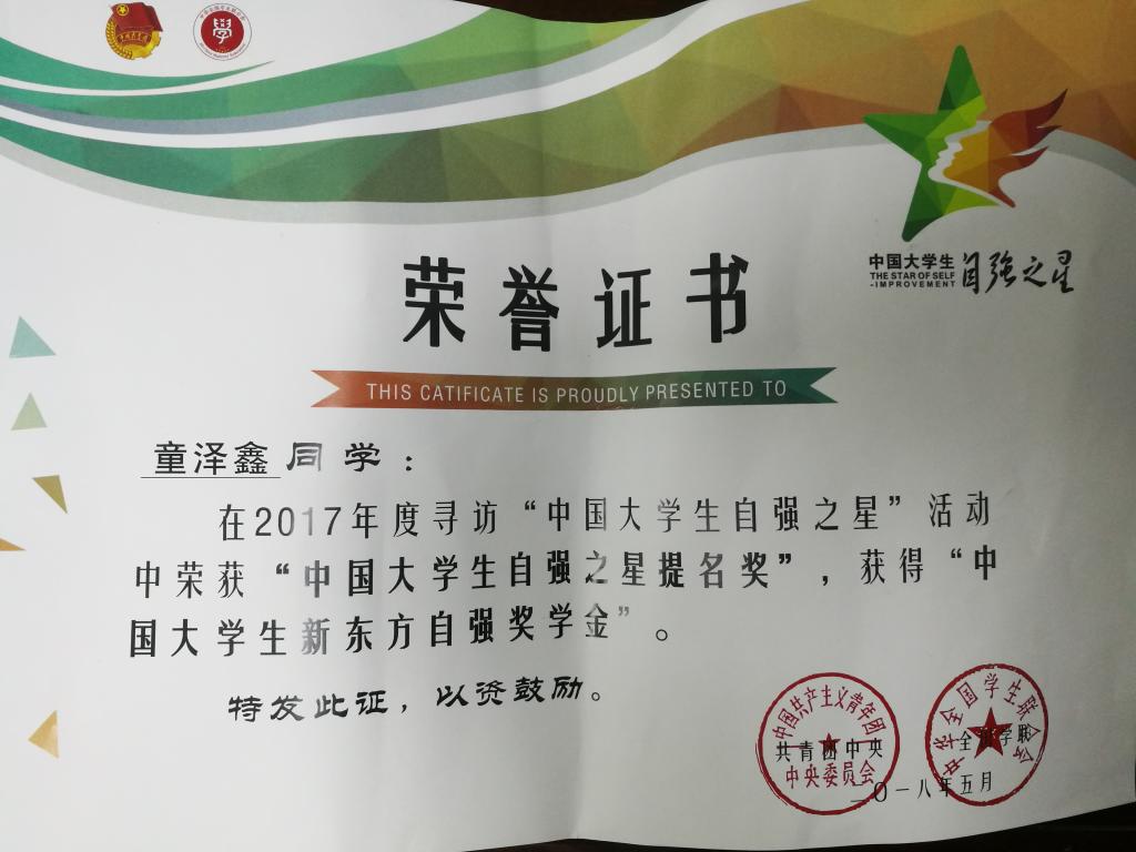童泽鑫获“中国大学生自强之星提名奖”