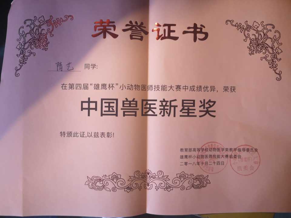隋艺获“第四届”小动物医师技能大赛中国兽医新星奖