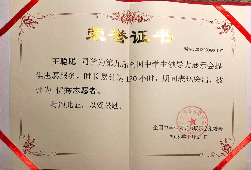 王聪聪获全国中国学生领导力优秀志愿者称号