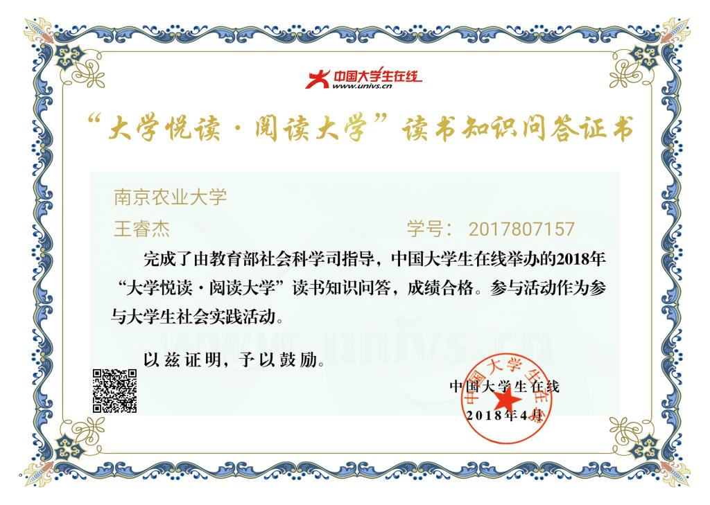 王睿杰获“大学悦读·阅读大学”读书知识问答证书