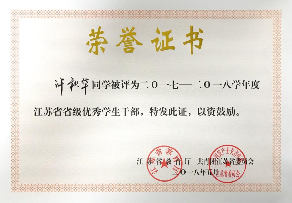 许秋华获江苏省省级优秀学生干部