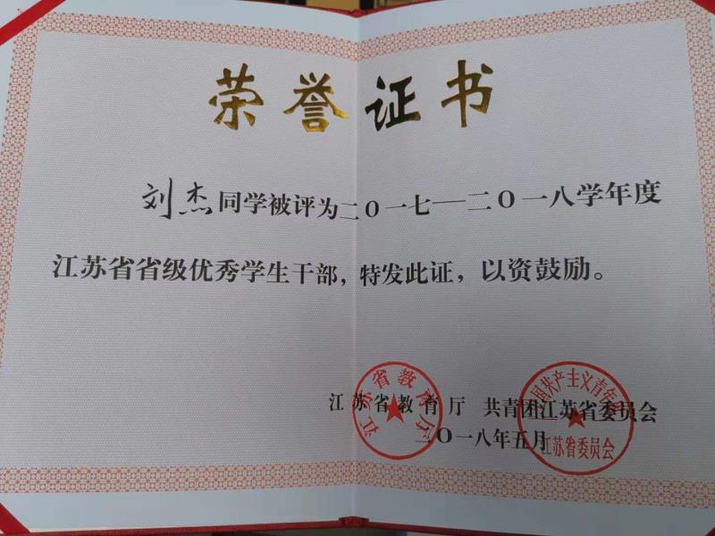 刘杰获江苏省省级优秀学生干部
